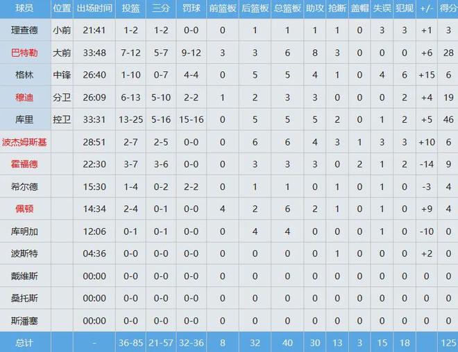 还得是库昊,投篮25中13(三分16中5),罚球16中15爆砍46分外加5板5助2断,带领勇士125-120击败马刺,全队暂时获得喘息空间。